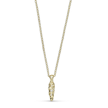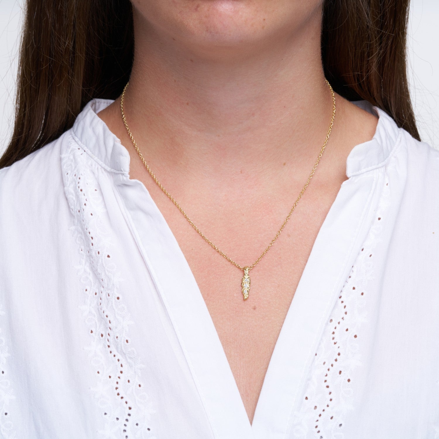 Denne Iris halskæde har et lille vedhæng, som skaber en unik balance mellem vedhængets bankede overflades glød og zirkonernes skarpe glans.
