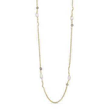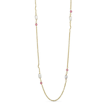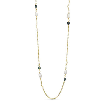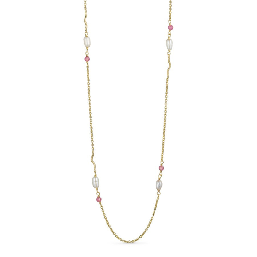 Den 24K guldbelagte kæde er enten beklædt med naturstenene labradorit, smaragd hydro eller pink tourmalin og ægte ferskvandsperler. Disse natursten formår i sammenspil med de ægte ferskvandsperler at skabe et smykke, hvori naturens variationer er indfanget i hver eneste detalje.