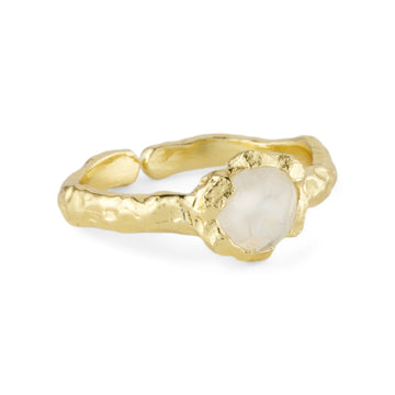 Alina ringen hylder naturens skønhed og dualitet. Ringen er besmykket med den ægte natursten, rosa kvarts, som symboliserer kærlighed. Sammen harmonerer ringens rå og bankede greb med naturstenens blanke og mangefacetterede skær.