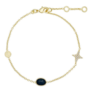 Das Joanne-Armband ist mit einem kleinen grafischen Anhänger sowie einem mit feinen Zirkonen besetzten Sternanhänger verziert. In der Mitte des Armbands befindet sich der wunderschöne Naturstein schwarzer Onyx, der einzigartige Variationen und natürliche Energien besitzt. Zusammen bilden die Anhänger das elegante Armband, das reich an Details und Ausdruck ist.