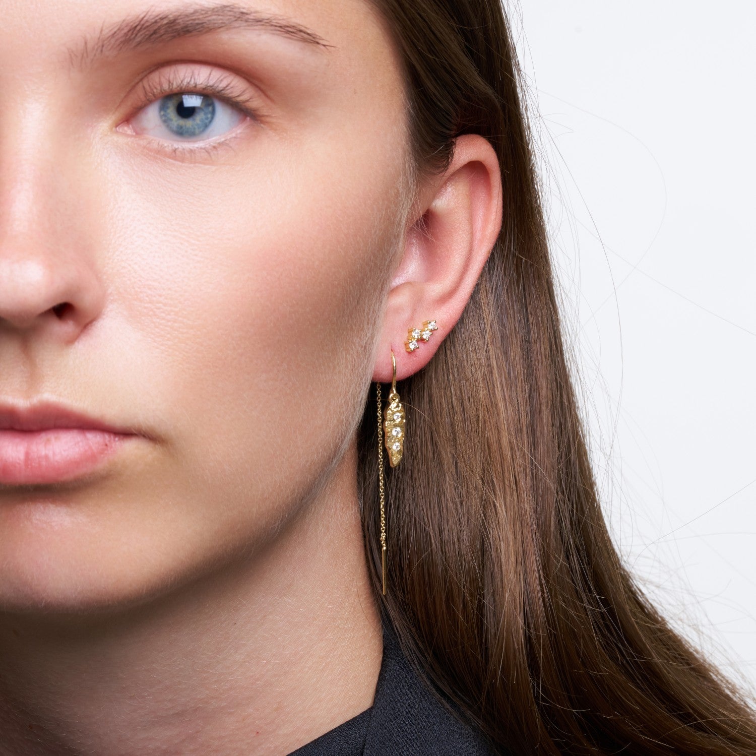 An den feinen Ketten dieses Ohrrings befindet sich ein kleiner Anhänger, der eine einzigartige Balance zwischen dem Glanz der geschlagenen Oberfläche des Anhängers und dem scharfen Glanz der Zirkone schafft.