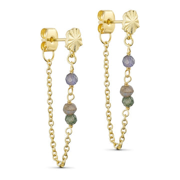 Unter der leuchtenden Florence-Blume hängt eine zarte und klassische Kette, die mit kleinen echten Natursteinen verziert ist. An diesen Florence-Ohrringen finden Sie die Steine Labradorit, Iolith und Moosachat. Diese Natursteine verleihen wunderschöne Farbtöne in kühlem Blau, Grau und zartem Grün. Zusammen ergänzen sie sich perfekt und verleihen den Ohrringen einen einzigartigen und charmanten Ausdruck.