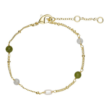 On this bracelet you will find the real natural stones, garnet and jade, as well as a real freshwater pearl.