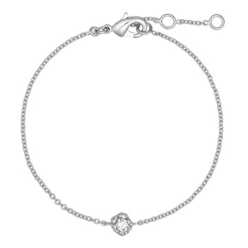 The classic bracelet is adorned with a clear zircon. The zircon sits in a textured, banked grip, providing a beautiful contrast to the shiny zircon and feminine chain.