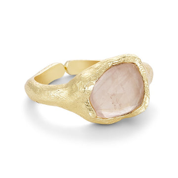 This Joanne ring is adorned with a large and impressive rose quartz. The subtle pink color of the natural stone creates a beautiful contrast to the rustic and organic ring.