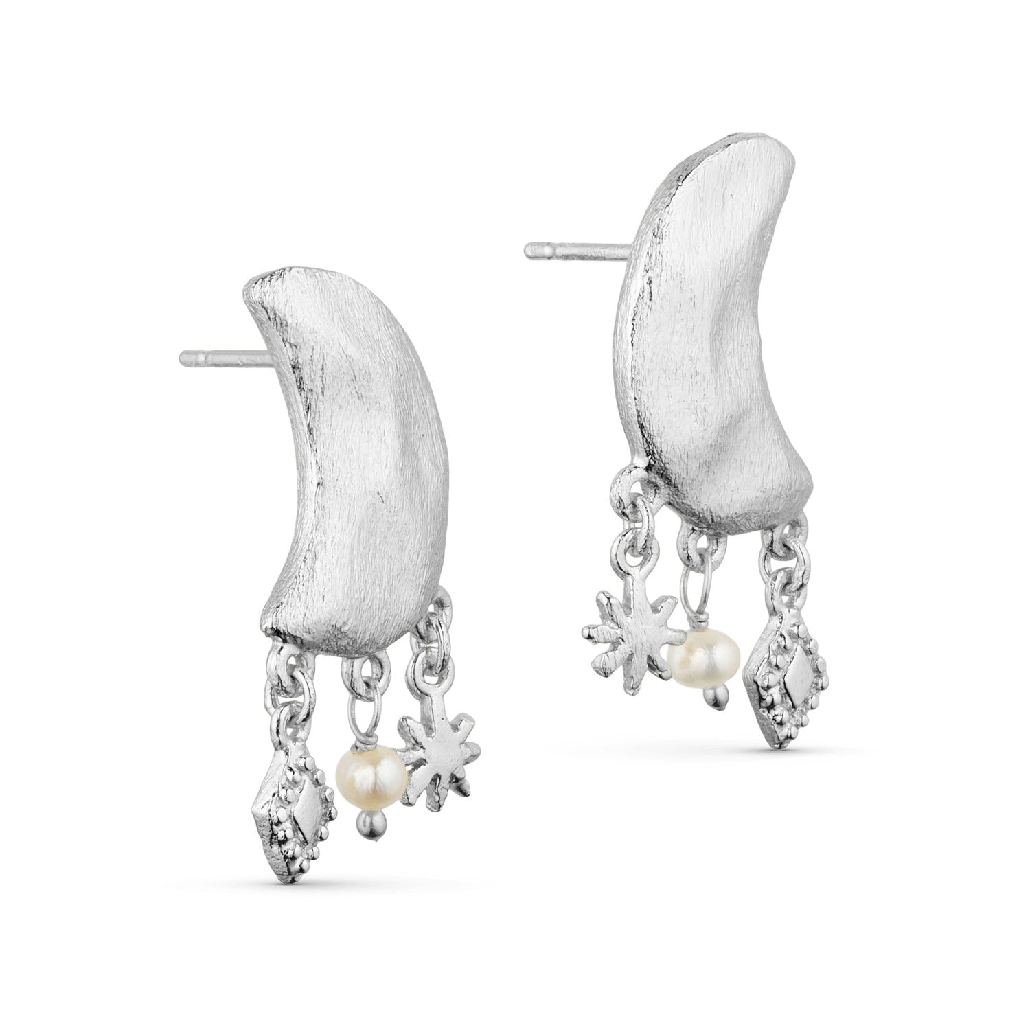 Under the unique earring, shaped like a crescent moon, you will find three pendants. Including a genuine freshwater pearl, which, in interaction with the organic moon, glows in the light.