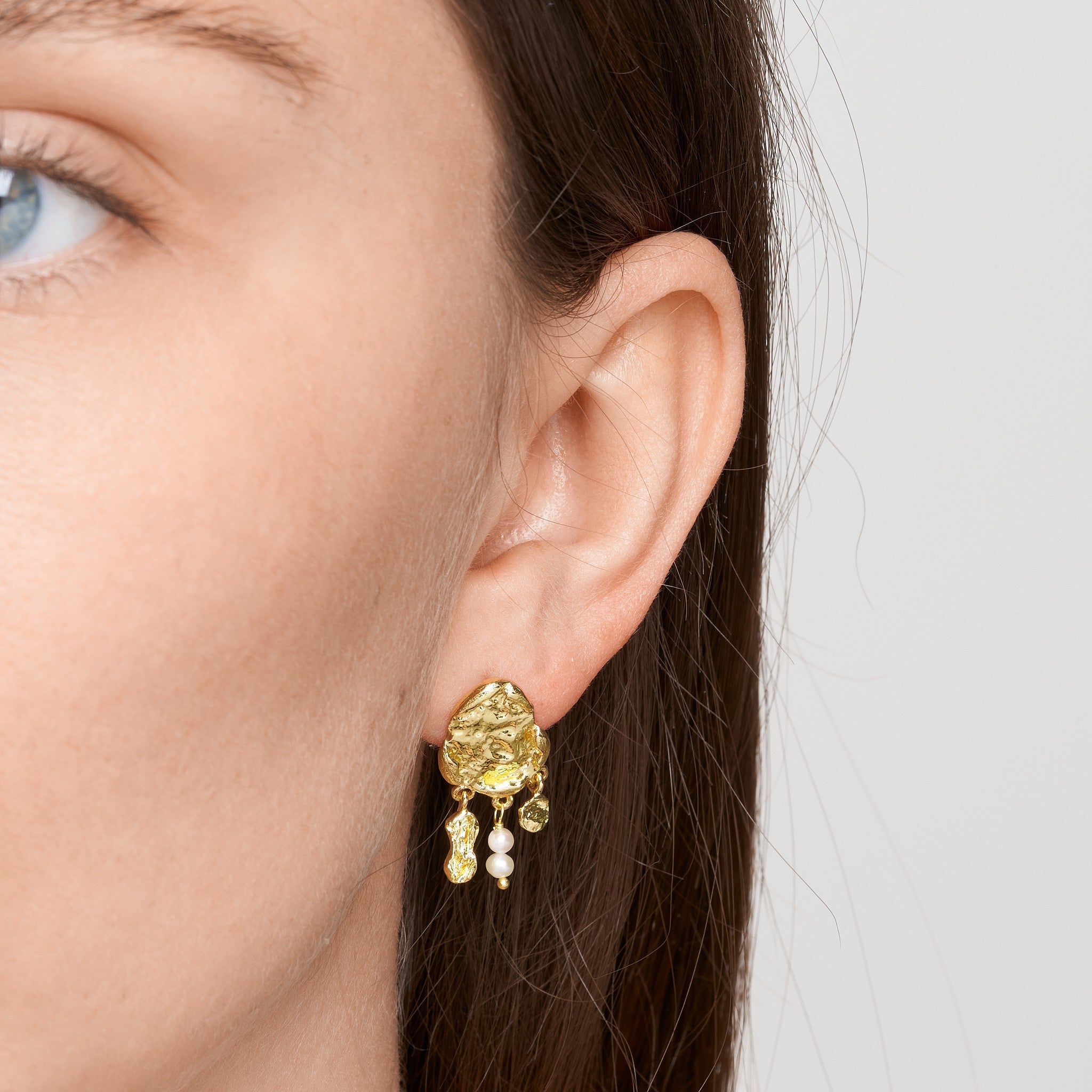 Den store ørestikker balanceres elegant med tre små vedhæng. Heriblandt finder du to små ægte ferskvandsperler, hvis glød harmonerer smukt med øreringens finish.