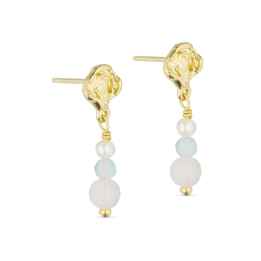De fine Josie øreringe er formet som små bankede plader, der nænsomt fanger lyset på smukkeste vis. Under ørestikkeren finder du en ægte ferskvandsperle, samt naturstenene, milky aqua og rosa kvarts.